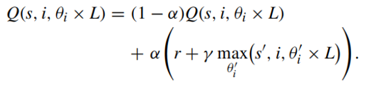 在上述公式中,Q(s,i,θ_i)表示当IIoT 系统处于s状态时,第i个UDi采用θ_i计算卸载策略时可以获得的长期未来奖励的估计。由于Q表要求其索引是一个非负整数,所以θ_i在Q函数中乘以L。值得注意的是,公式中的s’是IIoT系统中所有UD都采用计算卸载策略A后的状态,其中A包含此时第i个UD的计算卸载策略。也就是说,IIoT系统的所有UD在执行计算卸载策略A后都具有相同的状态s’。