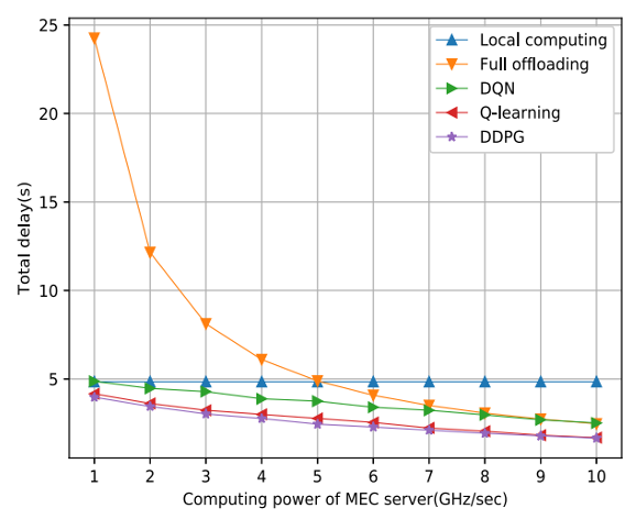 如图4所示,由于Local computing与MEC服务器的状态无关,所以Local computing的结果是一条直线,其他方案随着MEC服务器计算能力的增加,系统总时延逐渐减少,因此提高MEC服务器的计算能力有助于提高系统性能。当MEC服务器的计算能力大于7 GHz/s时,系统的总延迟缓慢降低。这是因为此时限制系统总时延的主要因素是传输时延。Q-learning算法和DDPG算法的时延始终低于基线算法。