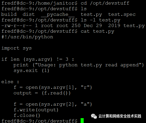 在外层文件夹/opt/devstuff发现个test.py,查看内容发现其完成的是把一个文件的内容追加到另一个文件,