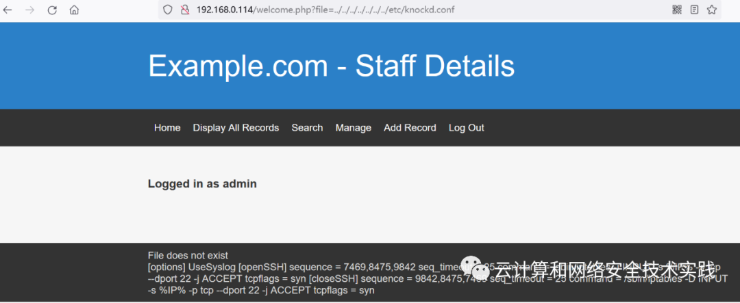 继续查看敲门的配置,http://192.168.0.114/welcome.php?file=../../../../../../../etc/knockd.conf,