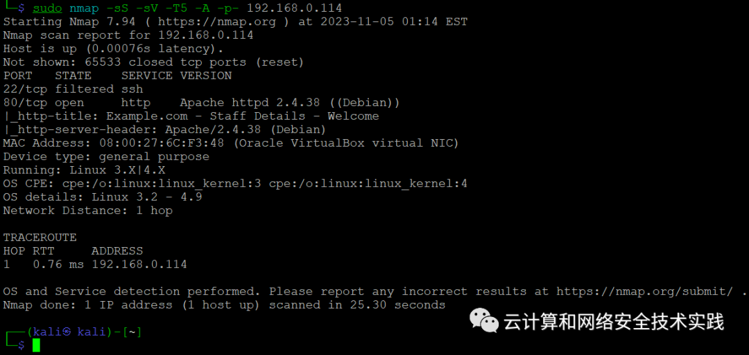 继续做端口扫描,sudo nmap -sS -sV -T5 -A -p- 192.168.0.114,