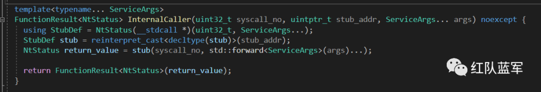 FreshyCalls 进行系统调用的关键函数是 stub,也就是作者构造的 mini shellcode,InternalCaller 将系统调用号和 syscall 指令地址传递给 stub 后,由 stub 处理最终的系统调用。