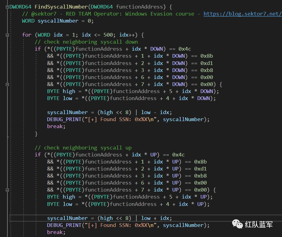 HWSyscalls 使用 HalosGate 相同的方法获取系统调用号,HalosGate 是 HellsGate 的变种,与 HellsGate 不同的是,HalosGate 并不是直接匹配所需函数的 stub,而是匹配所需函数相邻的系统函数以避免因为 hook 导致无法准确获取所需函数的系统调用号: