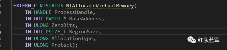 我们这里以 NtAllocateVirtualMemory 函数为例,先来看看 SysWhispers2 进行系统调用的基本流程。首先,主程序调用 NtAllocateVirtualMemory,该函数是头文件中的外部函数,如下: