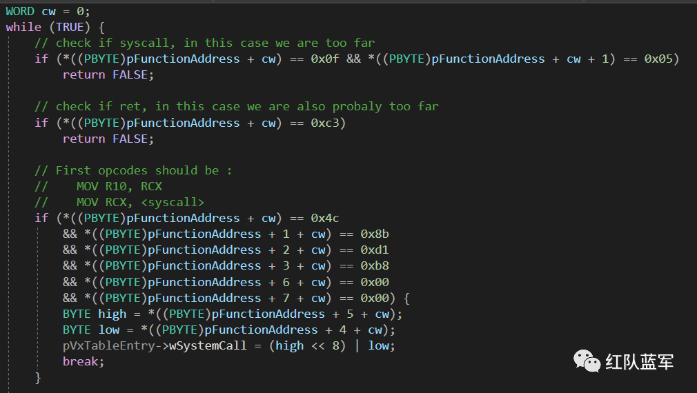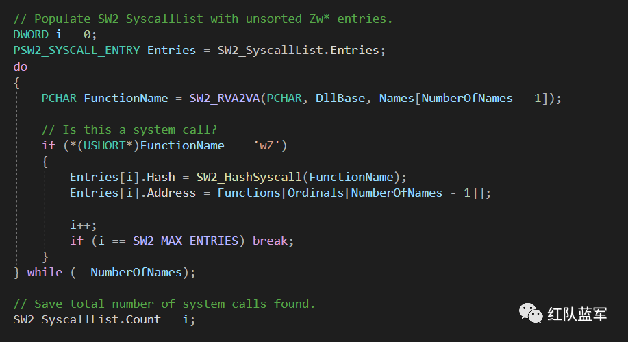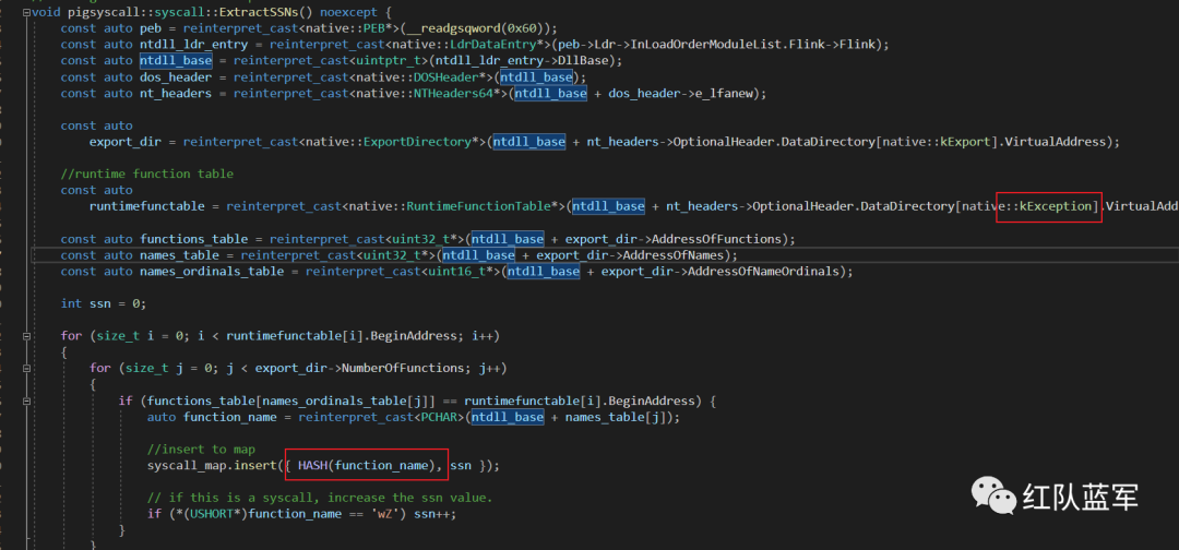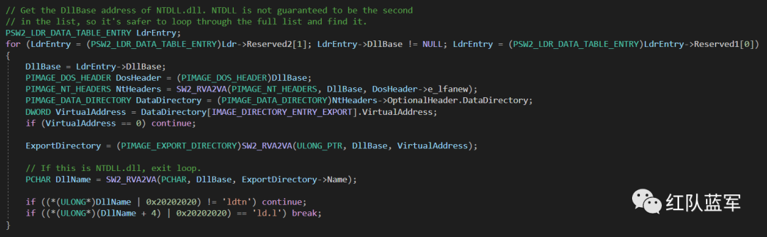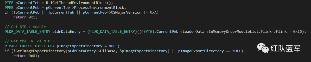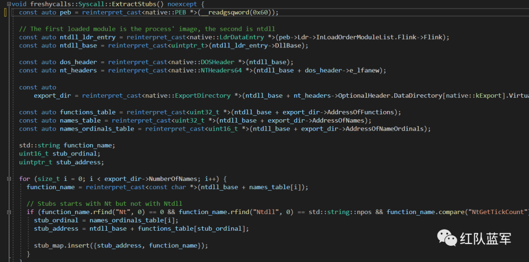 该项目通过遍历 PEB 找到 ntdll,之后遍历 ntdll 的导出表,在找到需要的导出函数后,通过匹配 syscall stub 中的特征字节码定位到该导出函数的系统调用号。(一)遍历 PEB 获取 ntdll 的导出表: