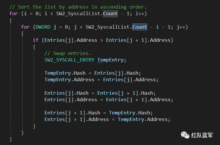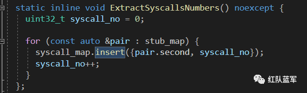 而 ExtractSyscallsNumbers 提取的是 stub_map 里的内容,stub_map 由 ExtractStubs 函数填充,该函数通过导出表按照地址顺序依次填入 Nt 函数的地址和函数名。在 SysWhispers2 中,我们介绍过,导出表地址的按照顺序排列即是系统调用号,在 ExtractSyscallsNumbers 函数中,syscall_map 按照地址顺序填入,syscall_no 循环递增就是对应函数的系统调用号了: