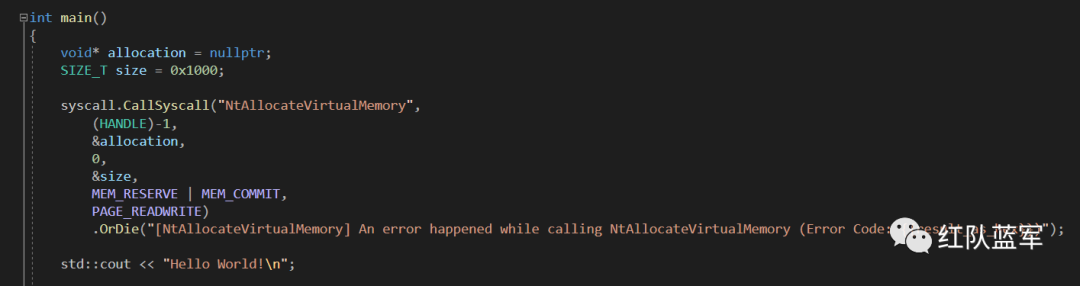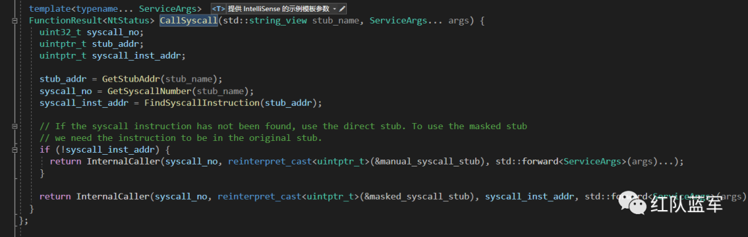 项目地址:https://github.com/crummie5/FreshyCallsFreshyCalls 是使用 C++ 的一些新特性实现的 syscall 项目,它使用模板通过 CallSyscall 函数可以实现任意 Nt 函数的系统调用,这样就不需要像 SysWhispers2 项目通过 python 脚本来生成模板,只需要在项目中引入头文件,之后通过 CallSyscall 函数调用指定的函数即可。如下,调用 NtAllocateVirtualMemory 函数: