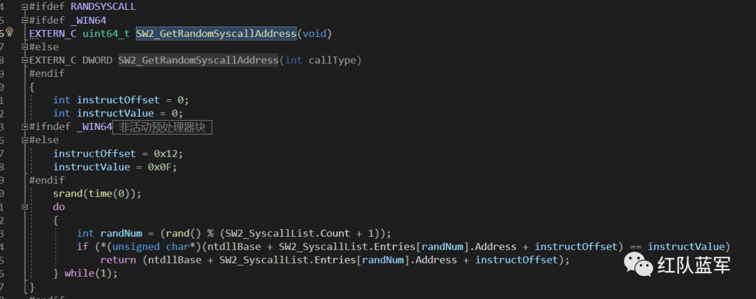 如上代码,Zw 函数起始偏移 0x12 的位置即是 syscall 指令,其对应的第一个字节是 0x0F。SysWhispers2 通过 SW2_GetRandomSyscallAddress 函数来随机获取一个 syscall 指令的地址,之后通过 call 指令调用该地址(位于 ntdll)上的 syscall 指令。