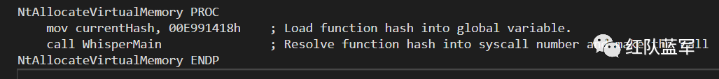 我们分析 SysWhispers2 提供的模板,发现该函数的实现是在 asm 文件中,它首先将该函数计算的哈希传递给 currentHash,之后调用 WhisperMain 函数: