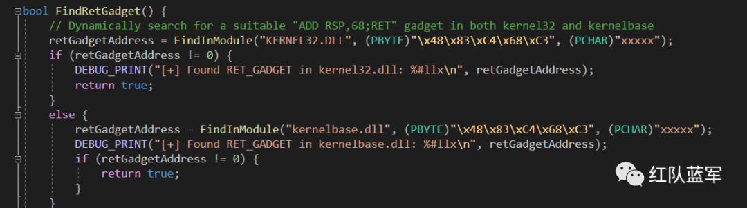FindRetGadget 函数用来在 kernel32 和 kernelbase 两个模块中查找合适的用于返回主程序的 Gadget,在该项目中是 ADD RSP,68;RET,硬编码为 \x48\x83\xC4\x68\xC3: