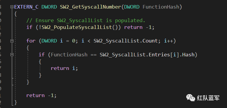 我们先来分析下 SysWhipers2 项目获取系统调用号的方式,在前面的分析中,我们发现 SysWhispers2 是通过函数 SW2_GetSyscallNumber 来获取系统调用号的,我们跟进一下: