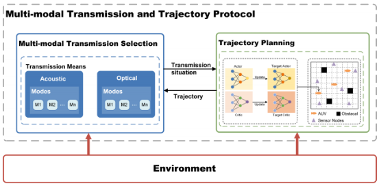 USNs数据采集协议联合多模态传输与轨迹规划设计如图2所示。传输和轨迹是数据收集的基础和相互作用。在图2中,传输选择部分由A段决定传输均值和方式,为B段的轨迹规划部分提供传输情况。同时,B段的轨迹规划决定水下机器人的速度和方向,并为A段的传输选择部分返回轨迹,两部分根据水下环境的观测进行决策。