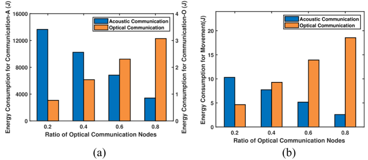 从图3(a)中可以看出,随着光通信节点数量的增加,所有节点的传输能耗下降,说明传输能量效率提高。从图3(b)中可以看出, 相比于通信能耗,移动能耗较小。当80%节点使用光通信时,所有AUV的移动能耗约为14.9J,而当20%节点使用光通信时,所有AUV的移动能耗约为21.1J。