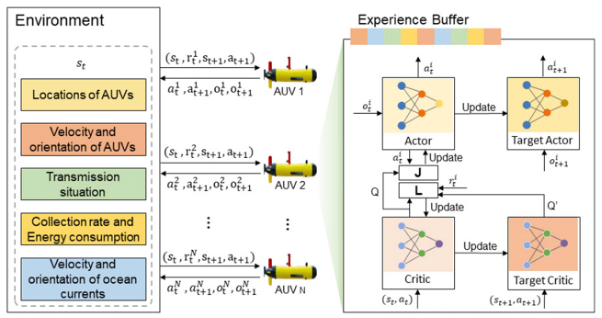 首先对所有AUV初始化N个critic网络Q^i(·)N个actor网络μ^i(·),参数分别为θ^Qi和θ^μi。初始化N个目标critic网络和N个目标actor网络。对critic网络和actor网络进行更新。AUV i的critic网络将损失函数最小化,更新为 。目标critic网络参数更新为 目标actor网络参数更新为: 。