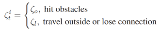 奖励函数:奖励功能分为惩罚和奖励两部分。作为惩罚,每个AUV被禁止在覆盖范围之外移动,或在其最大通信范围R内与所有剩余的AUV失去连接,以确保AUV之间的协作。AUV遇到障碍物时会受到惩罚,以保证其安全。惩罚记为