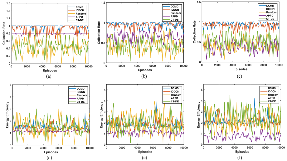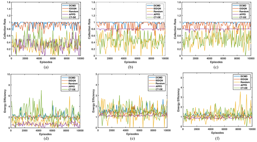从图6(a)、(b)、(c)可以看出,在20、25和30个节点时,DCMD的收集率明显优于CT-DE、APPD和Random方法。从图6(d)、(e)、(f)可以看出,DCMD的平均能效优于IDDQN、APPD和Random。虽然CT-DE的平均能量效率与DCMD相同,但其收集率仅为0.64,对于USN的数据收集来说过低。因此,DCMD的性能优于目前最先进的方法,具有更高的收集率和能量效率。