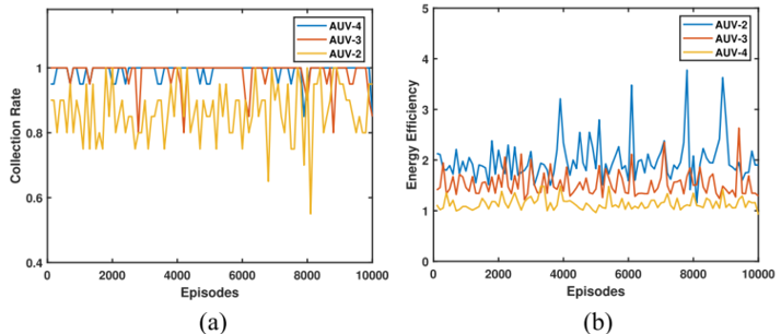 从图4(a)可以看出,随着训练时间的增加,AUV试图保持通信,避开障碍物,并考虑受洋流影响的收集率和能量消耗。因此,AUV的正奖励会上升。从图4(b)可以看出,收集率随时间线性上升,最终达到高收集率,保持在90%以上的波动。从图4(c)可以看出,能量效率的变化趋势与收集率的变化趋势一致。