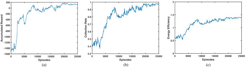 图4 训练期间的累积奖励:(a)累计奖励 (b)收集率 (c)能源效率