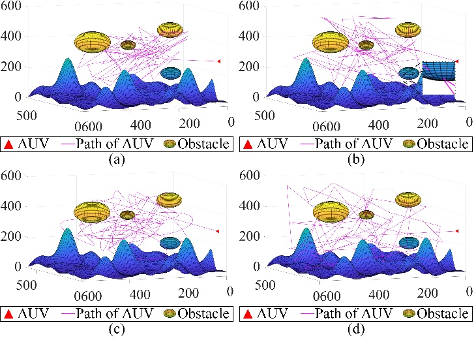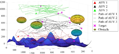 由于前两部分已经验证了所提出创新点的优越性,因此这个部分只验证HAFCS的有效性。本文先用3个AUV搜索一个的水下区域,其中有四个随机移动的障碍物和固定不动的海底地形,以及10个随机移动的目标。路径图如图8所示。从图8中可以看出,3个AUV搜索各自的区域,几乎没有冗余搜索。3个AUV的路径经过了所有的目标,即搜索率为100%。此外,AUV的路径并没有与障碍物和海底地形发生碰撞,并且与之相距较远,体现了所提出方法的安全性。