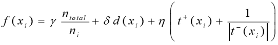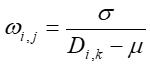 其中,ω_i,j是一个自适应因子,取决于当前两个蜜源之间的距离和其他蜜源之间的距离,可以描述为:
