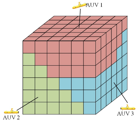 本文所提出的方法适用于多AUV的全覆盖搜索,因此需要先进行任务分配。在环境建模中,本文采用立方体建模方法,即假设任务区域为长方体,将其划分为若干个相同的立方体。立方体边长根据AUV的探测距离设置,使得AUV在立方体中心时探测范围能够覆盖整个立方体,因此将所有立方体中心作为任务,采用改进的Voronoi聚类策略进行分配。