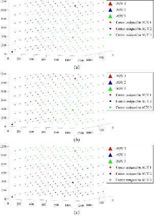 图5 任务分配方案的对比。(a)Voronoi聚类策略。(b)基于SOM的对偶竞争策略。(c)改进的Voronoi聚类策略