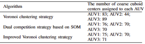 在任务分配算法的实验中,为了证明所提出任务分配算法的有效性,引入了两个对比算法:1)voronoi聚类策略;2)基于自组织映射(SOM)的对偶竞争策略。三种方法的任务负载平衡度如表I所示,具体分配方案如图5所示。