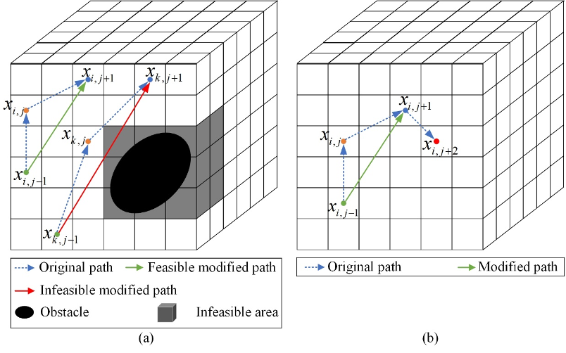 在先前的使用LOS检查的文献中,都是尽可能多地使用LOS检查来删除路径点。这种做法虽然大大减少了转向角的数量,但可能导致不实际的转向角,如图3(b)所示。在图3(b)中,在x_i,j处做LOS检查后,修改了路径。虽然减少了一个转向角,但新路径中x_i,j+1处的转向角太大,对AUV来说明显是不实际的。