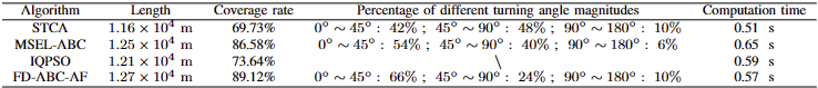 从表II可以看出,STCA得到了最短的路径,但它在覆盖率和平滑度方面最差。IQPSO所规划路径长度最短,但优势并不明显,且覆盖率与两种改进的ABC相差较大。两种改进的ABC在路径长度和覆盖率方面性能相近,但从转向角的占比情况可以看出,MSEL-ABC所规划路径存在较大的转向角;从计算时间可以看出,由于多策略进化数据库和反馈机制,MSEL-ABC需要更大的计算成本,这在大规模任务下会导致较差的鲁棒性。