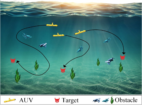 在水下物联网中,环境具有未知性,使用自主水下航行器(AUV)来进行全覆盖搜索已经成为不可避免的趋势。水下全覆盖搜索任务模型如图1所示,针对未知的水下环境,为AUV集群规划路径,以搜索环境中的目标。在执行全覆盖搜索任务时,最重要的方面是最大程度地提高任务区域的覆盖率并最小化AUV路径的长度以减少能耗。其次,由于水下环境的特点,如存在洋流和障碍物,AUV路径需要保持一定水平的平滑度。最后,考虑到大规模任务场景,算法的计算复杂性应尽量降低。然而,很少有方法可以满足上述要求。