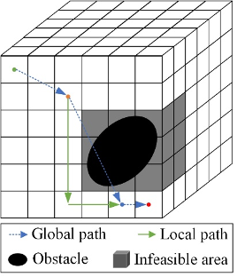 2)路径平滑技术:由于全局路径规划中对于转向角的约束是软约束,所规划的全局路径中仍然可能出现太大的转向角,因此需要路径平滑技术来对全局路径进行平滑处理。本文改进了LOS技术,用于路径平滑处理。LOS技术通过LOS检查对路径进行后处理,原理如图3(a)所示。在图3(a)中,有两条原始路径,用蓝色虚线表示。我们可以对路径中的某一个路径点做LOS检查,即判断该路径点是否可以被跳过,从而将路径修改为由它的父节点直接到达它的子节点。例如,路径点x_i,j可以被跳过,从而将路径修改为绿色路径,减少一个转向角。而路径点x_k,j显然不能被跳过,因为修改后的路径经过与障碍物相交的不可行域。