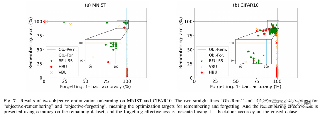 图7展示了我们的方法对于unlearning中的双目标的优化结果。对比的state-of-the-art方法通常只能取得单目标的最优而很难同时获得双目标的最优。我们的RFU-SS方法则可以同时达成双目标的最优化。