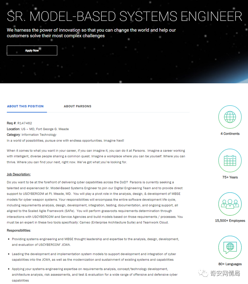 帕森斯公司近日已经开始就向美国网络司令部提供服务招聘高级基于模型的系统工程师,工作地点位于美国马里兰州乔治·米德堡,即美国网络司令总部所在地。招聘通知称,帕森斯公司目前正在寻找一位才华横溢、经验丰富的高级基于模型的系统工程师加入数字工程团队,并为美国网络司令部提供直接支持。具体的工作职责包括: