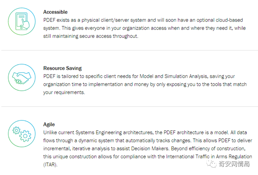 PDEF是一种使用商用现成(COTS)技术和根据客户特定需求配置的开源工具的架构。它支持数字任务工程(DME)、基于模型的系统工程(MBSE)、基于模型的工程(MBE)、分布式工程(DE)以及各行业的协作决策支持。PDEF 还可以与新的创新技术集成,使用户能够在增强现实环境中工作。