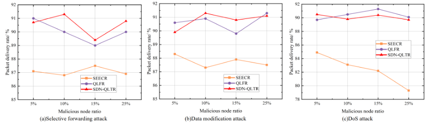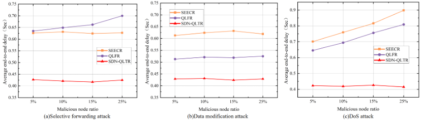 平均端到端时延指的是数据包从源节点发出到目的节点接收的持续时间。如图11所示,虽然QLFR不能检测到选择性转发攻击,但由于Q-learning的作用,时延的增长幅度较慢。如图11(a)所示,三个方案的端到端时延都比较稳定,因为它对端到端时延基本上没有影响。在其他两种类型攻击中,由于SDN-QLTR可以比较准确的识别到恶意节点,因此平均端到端时延都比较平稳。QLFR和SEECR都不能识别DoS攻击的节点,随着恶意节点比例的增大,时延也增大。