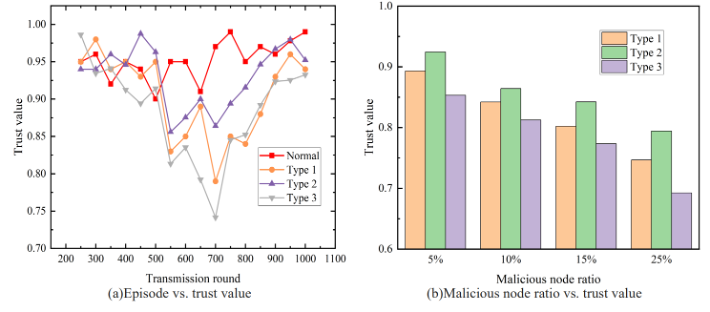 本文使用MATLAB 2019模拟部署在500m×500m×500m的水下网络。为了验证本文提出的SDN-QLTR方法的有效性,分别验证了不同攻击类型和不同恶意节点比例对信任值和检测率的影响。通过改变攻击类型、恶意节点的比例和节点数量等因素来评估所提出的SDN-QLTR方法的性能。