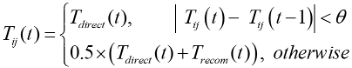 如果节点| TVij(t)- TVij(t-1)|小于阈值θ,认为它当前时刻是可信的,不再使用推荐信任值来计算信任值。当节点ni对节点nj评估的信任值TVij(t)与上一时间段的信任值TVij(t-1)的差值大于阈值时,使用推荐信任判断节点的可信度,推荐信任值为: