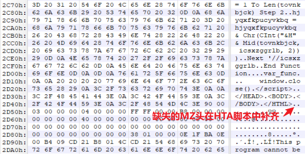 该文件存放于LNK文件尾部,通过mshta.exe程序进行启动。根据行为猜测,mshta.exe通过定位标记点启动HTA,故不需要通过提取HTA文件来启动HTA文件。