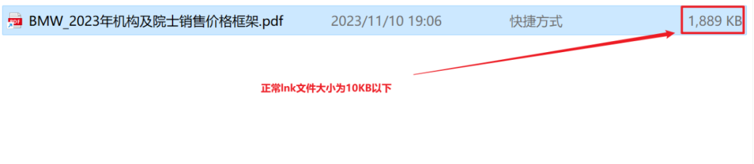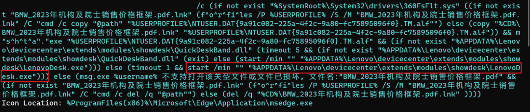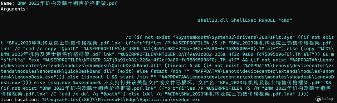 原始样本为“BMW_2023年机构及院士销售价格框架.pdf.lnk”。该文件内置了四部分内容,分别是:lnk参数、诱饵文档、dropper程序和hta文件,四部分内容通过相互配合完成既定功能目标。