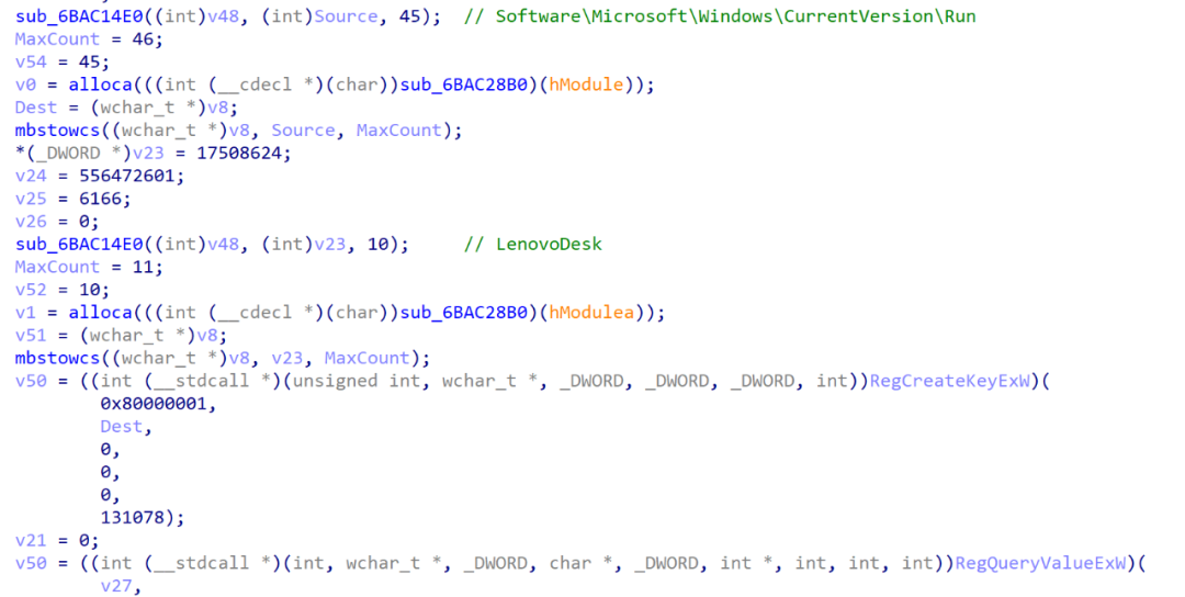 黑文件加载后,其DllMain函数中执行解密操作,解密出后续的载荷。同时,通过ShowBatteryGauge导出主要功能,将LenovoDesk.exe写入注册表的启动项中,实现自动启动。