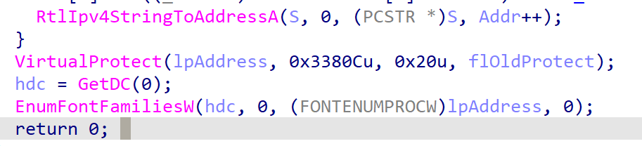 解密后的数据为IP点分十进制数据,通过 RtlIpv4StringToAddressA 函数将点分十进制IP地址转化为HEX地址形式数据,HEX地址形式的数据为COBALT_STRIKE数据,之后通过设置枚举字体的回调立即启动Cobalt_Strike.