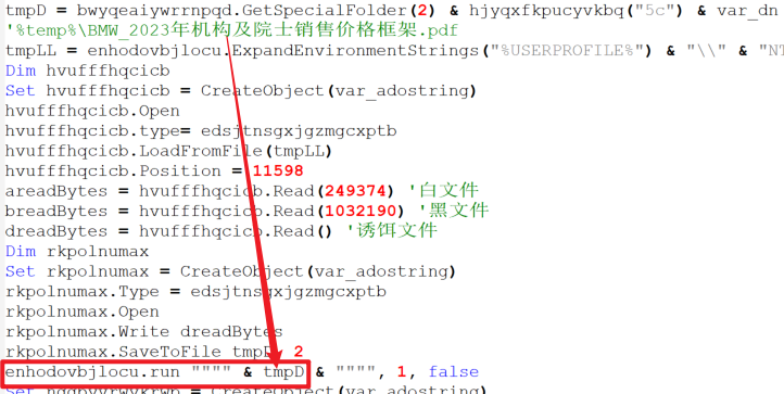 保存诱饵文档数据至本地%temp%\BMW_2023年机构及院士销售价格框架.pdf,启动BMW_2023年机构及院士销售价格框架.pdf文件。