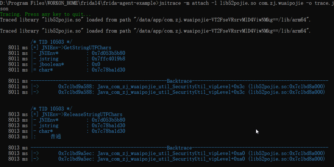 复制代码 隐藏代码jnitrace -m attach -l lib52pojie.so com.zj.wuaipojie -o trace.json //attach模式附加52pojie.so并输出日志