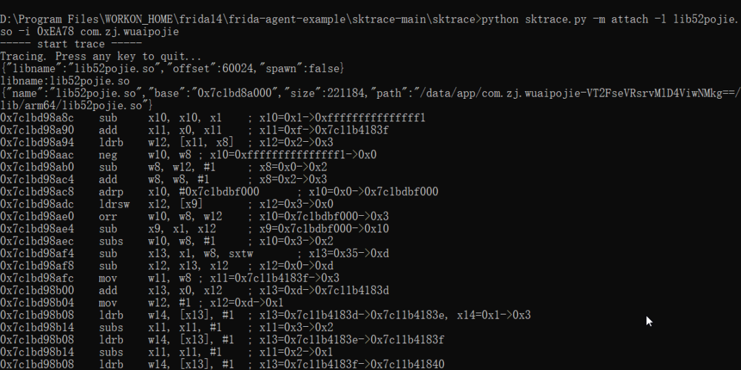 复制代码 隐藏代码python sktrace.py -m attach -l lib52pojie.so -i 0x103B4 com.zj.wuaipojie