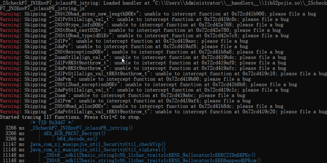 frida-trace -U -F -I "lib52pojie.so" -i "Java_" #附加当前进程并追踪lib52pojie.so里的所有Java_开头的jni导出函数