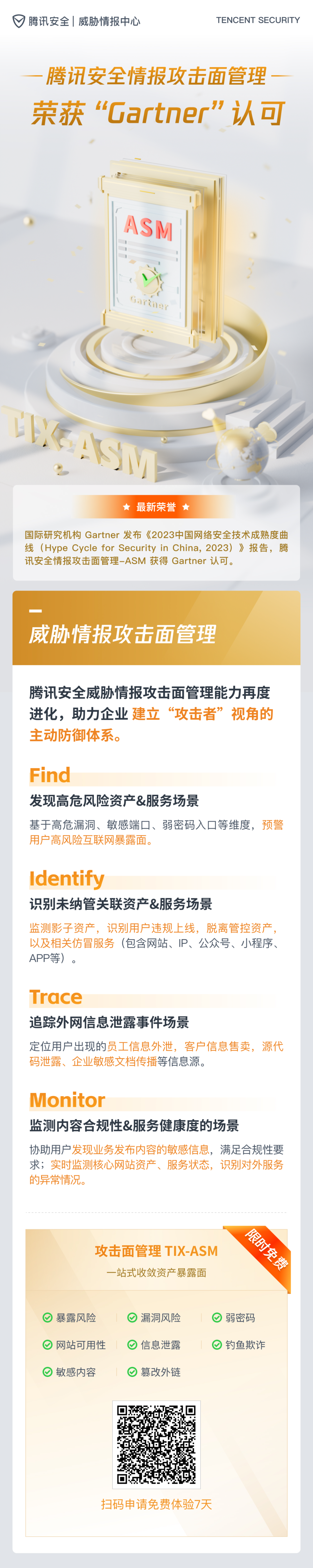 近期腾讯安全威胁情报攻击面管理(TIX-ASM)返场大促提供免费试用活动,可扫描海报二维码获取更多信息。