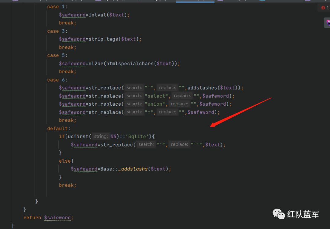 这里safeword()存在两个函数的传入 一个传入的text的值,一个是写死的level=8,这里我不太能理 解这个写死是什么意思,不重要了我们跟一下逻辑,首先判断传入的text是不是数组,明显我们这次传 参是文本,然后进入switch语句,level的值写死为8,直接进入default分支,首先判断是不是sqlite数据 库,如果是就进行单引号替换为双引号,如果不是进入addslashs()函数。